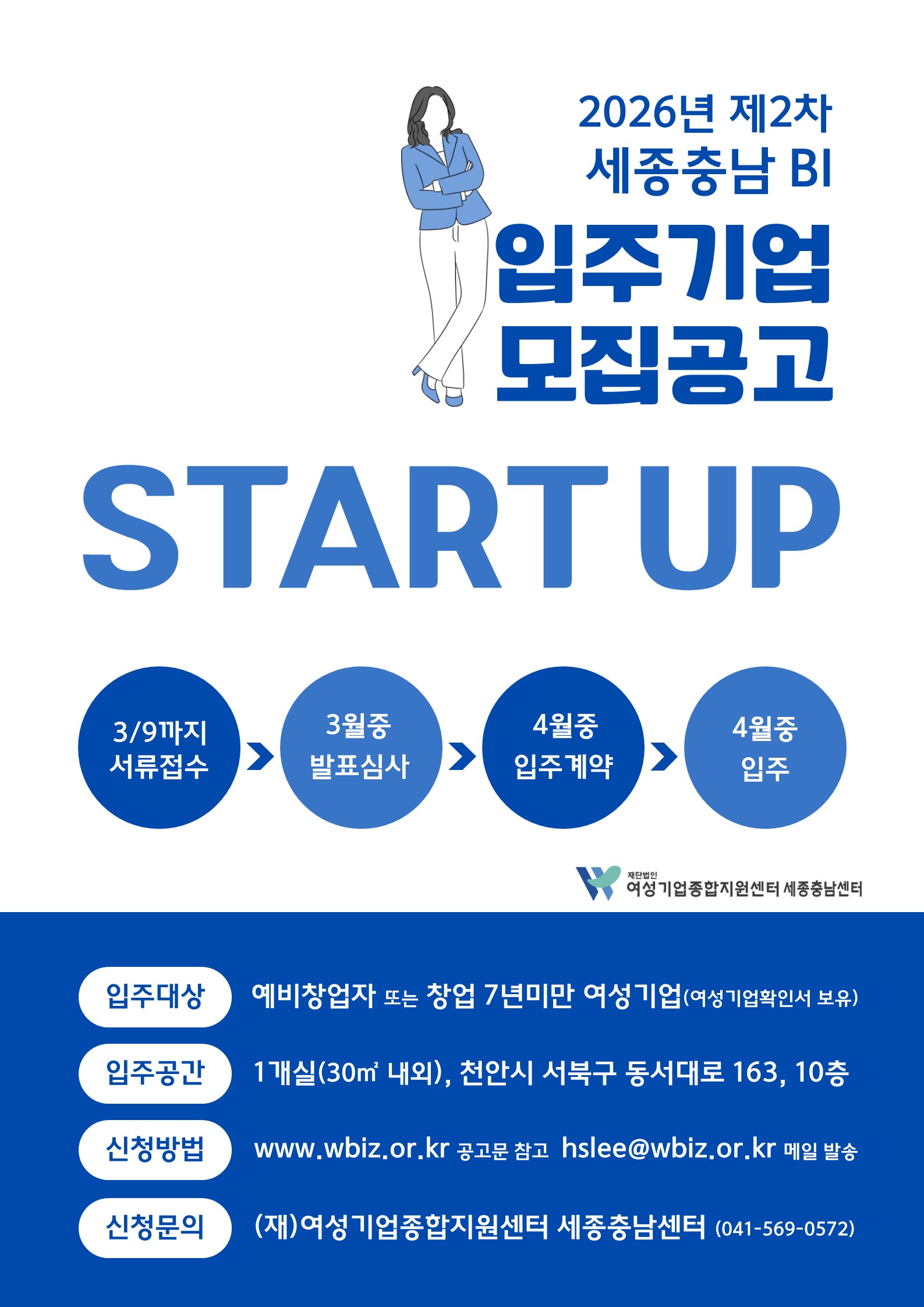 여성기업의 안정적인 창업 기반 조성과 성장을 지원하기 위해 「2026년 제2차 세종충남 BI 입주기업 모집」 을 아래와 같이 안내드립니다.